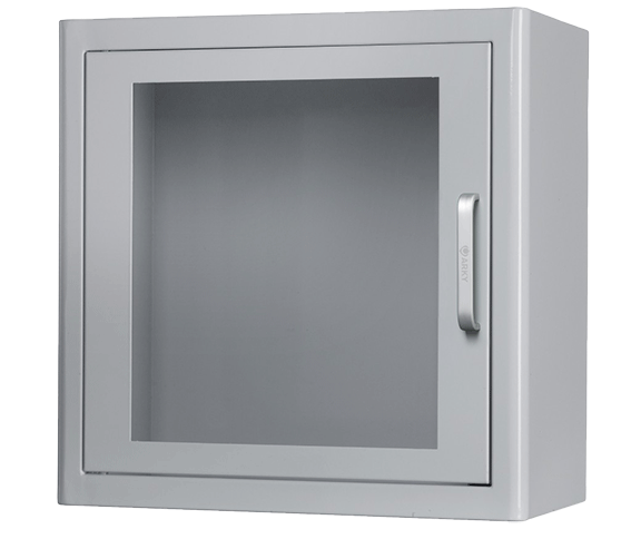Det är ett mycket stilrent och fint vitt plåtskåp till din hjärtstartare. Det har ett batteridrivet larm som utlöser när lyckan öppnas. Larmet kan inaktiveras om man vill. Det passar till de flesta hjärtstartare.