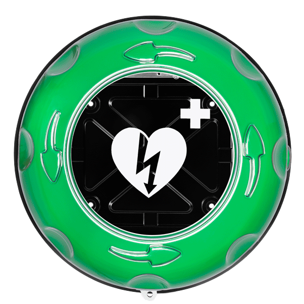 Skåpet öppnas genom en enkel vridning som avlägsnar locket. Hjärtstartaren sitter i justerbara fästen för snabb och enkel åtkomst.